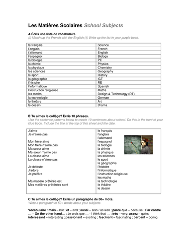 French Vocabulary List School And School Subjects With Vocab Test